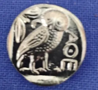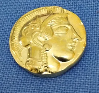 Moneta commemorativa che riproduce un antico tetradramma Ateniese - Realizzata in metallo dorato. - Presenta un profilo di figura con dettagli elaborati.