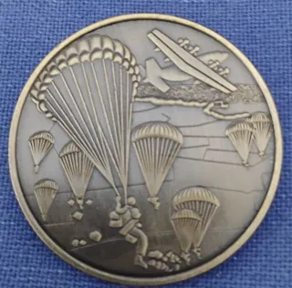 Moneta commemorativa con design a tema paracadutismo militare. - Raffigurazione di paracadutisti in azione. - Dettaglio di un aereo da trasporto. - Bordo metallico con finitura anticata.