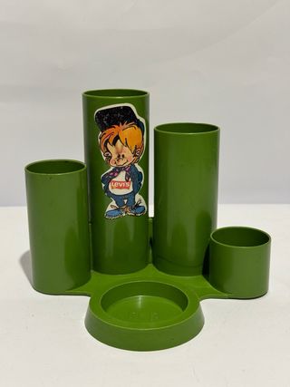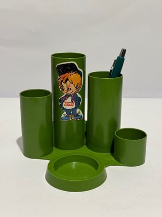 Portapenne / organizer da scrivania vintage anni 70/80 in plastica verde con design molto particolare space age. Struttura con più cilindri porta penne/matite e vaschetta centrale porta oggetti (graffette, gomme, monete ecc.). Marchio NP stampato alla base. Gli adesivi presenti sono stati aggiunti successivamente e possono essere rimossi facilmente se si preferisce l’estetica originale. Condizioni buone vintage con normali segni del tempo e dell’uso. Struttura integra. Perfetto per: scrivania vintage, studio, collezionismo anni 70/80, arredamento retrò, organizer da ufficio. portapenne vintage organizer scrivania anni 70 80