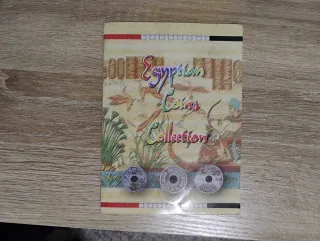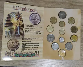 Bellissimo cofanetto che raccoglie monete egiziane. - Moneta Women Worldly Year 1975 con decreto del Primo Ministro N'944/1975. - Moneta Centenary of the Egyptian Real estate bank (non circolata). - Illustrazioni raffiguranti la Regina Nefertiti, scribi egizi e scene agricole. - Iscrizione araba Egyptian Real estate Bank sul retro di una moneta.
