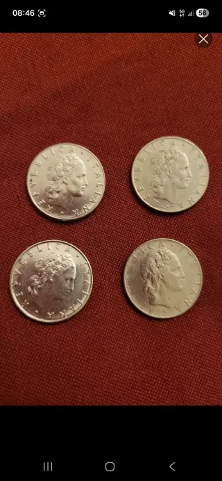 Vendo 4 monete italiane da 50 lire, coniate tra il 1966 e il 1985. Sono in ottime condizioni.