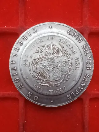 Riconio Ufficiale 1 dollaro Guangxu "Pei Yang Coin Silver Sample". Composizione: Rame-nichel-ferro. Peso: 32,50 grammi. Diametro: 50 mm. Spessore: 2 mm.
