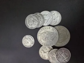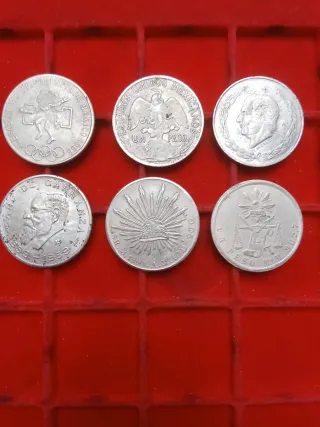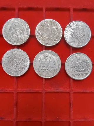 Lotto di 6 monete messicane, coniate in Riconio (ristampa) in materiale magnetico. - Moneta con figura di atleta e anelli olimpici, 1968. - Moneta con aquila e stemma nazionale, Un Peso. - Moneta con profilo di personaggio storico. - Moneta con El Sol de la Libertad, Un Peso, 1891. - Moneta con stemma nazionale e bilancia, Un Peso, 1990.
