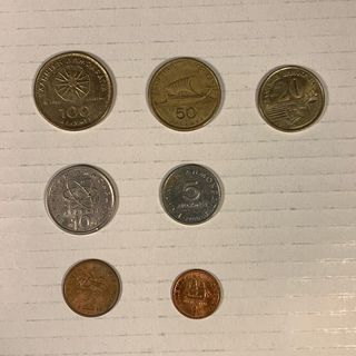 Serie di sette monete greche, dracme. - Monete con effigi storiche. - Diverse dimensioni e metalli.