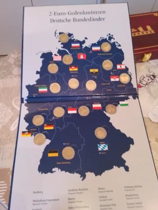 Album per la collezione di monete da 2 Euro commemorative degli stati federali tedeschi (Bundesländer). - Mappa della Germania con le posizioni delle monete. - Bandiere degli stati federali. - Spazio per 16 monete da 2 Euro.