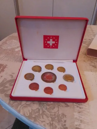 Bellissimo set di monete euro svizzere del 2003, presentato in una scatola rossa. - Monete in perfette condizioni. - Scatola con interno in velluto bianco e croce svizzera. - Ideale per collezionisti.