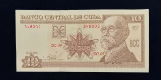 Bancon Central de Cuba, 10 Pesos, anno 2013. Banconota non circolata quasi fior di Stampa - Fior di stampa - Serie: 348002 - Denominazione: Diez Pesos - Firma: Presidente del Banco - Sigla: BCC - Anno: 2013