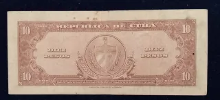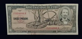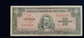 Banconota da 10 pesos cubani del 1958. - Denominazione: 10 Pesos. - Anno: 1958. - Paese: Cuba. - Stampa: Thomas De La Rue & Company Limited, London. Banconota circolata in un buon stato di conservazione bb