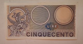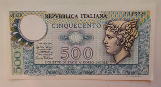 Banconota da 500 lire della Repubblica Italiana, raffigurante Mercurio. Condizioni fior di stampa. - Serie A09. - Numero di serie 501936. - Biglietto di stato a corso legale. - Firma Castine heron e Sewn Faben.
