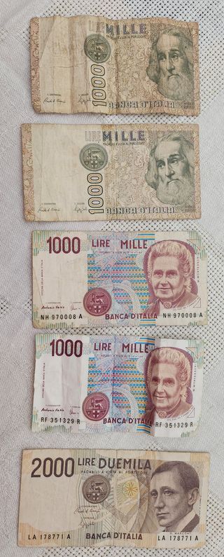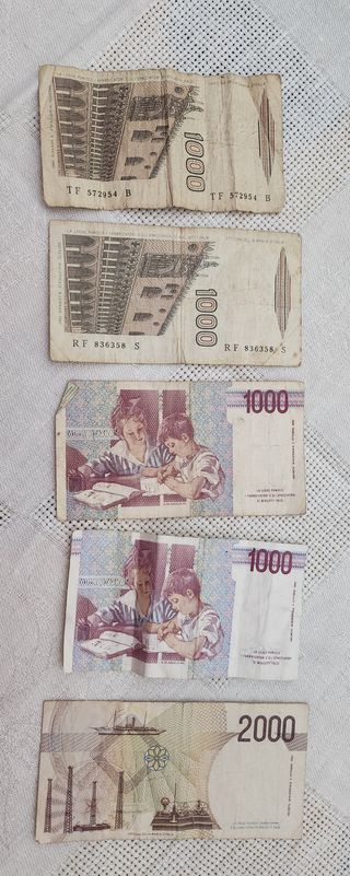 Lotto 5 banconote: 2 Lire 1000 Marco Polo; 2 Lire 1000 Maria Montessori; 1 Lire 2000 Guglielmo Marconi.