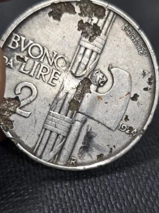 Buono da 2 Lire" del 1924, emesso durante il regno di Vittorio Emanuele III. Non è considerata una moneta classica, ma un buono di cassa coniato in nichel per sostituire i buoni cartacei , Nichel, 10 grammi.Diametro: 29 mm lato mostrato Presenta un fascio littorio con la scure a destra, affiancato dalla scritta "BUONO DA LIRE 2" e l'anno di emissione Incisori P. Morbiducci e A. Motti La lettera "R" in basso indica la Zecca di Roma. - Dritto: Fascio littorio. - Rovescio: Figura femminile con cornucopia. - Incisori: P. Morbiducci, A. Motti.