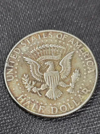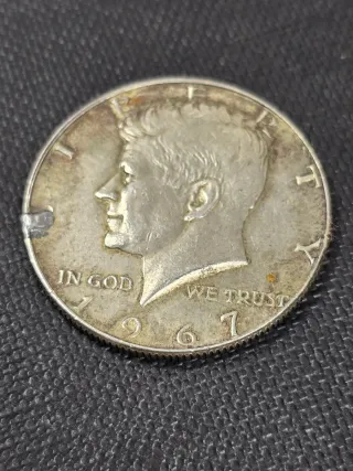 Mezzo dollaro Kennedy del 1967. Presenta il ritratto di John F. Kennedy sul dritto, disegnato da Gilroy Roberts. Il rovescio mostra il sigillo presidenziale, creato da Frank Gasparro. Le monete coniate tra il 1965 e il 1970 contengono il 40% di argento. - Dritto: Ritratto di John F. Kennedy. - Rovescio: Aquila stilizzata con scudo.