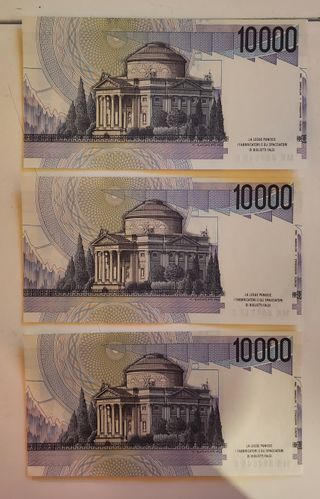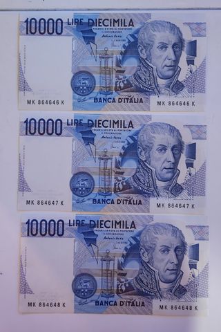 Lotto di 3 banconote da 10.000 Lire, nuove e con serie consecutiva. - Serie MK 864646 K - Serie MK 864647 K - Serie MK 864648 K