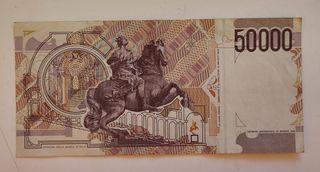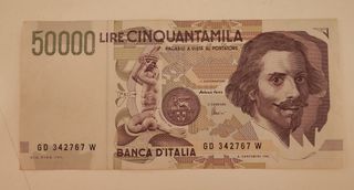Banconota da 50.000 lire emessa dalla Banca d'Italia. - Valore: 50.000 Lire - Emittente: Banca d'Italia - Serie: GD 342767 W - Firma del Governatore: Antonio Fazio - Firma del Cassiere: (illeggibile) - Incisore: GIO. PINO INV. - Stampatore: A. CANTARINI INC.