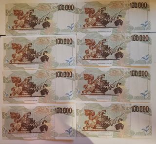 8 Banconote da Lire 100.000 in serie consecutiva: da TA 533976 C a TA 533982 C. Fior di stampa.