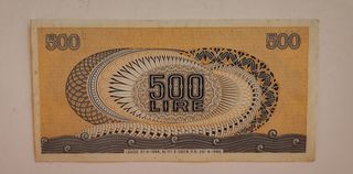 Banconota da 500 Lire della Repubblica Italiana, emessa nel 1966. - Condizioni fior di stampa. - Dettagli grafici con aquila, donna e delfini. - Valore nominale: 500 Lire. - Serie M01, numero di serie 211939.