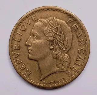 Moneta da 5 Franchi francesi del 1933 in nichel. - Dritto: Testa di Marianne con corona d'alloro, legenda REPUBLIQUE FRANCAISE e firma A. LAVRILLIER. - Riferimento anno: 1933. - Materiale: Nichel. SPL xf