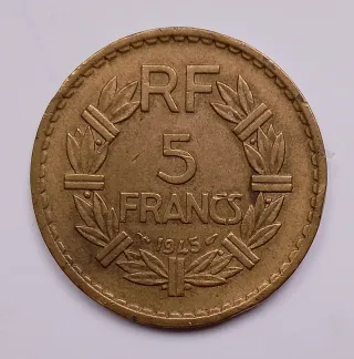 Moneta da 5 Franchi della Repubblica Francese, coniata nel 1945 xf SPL - Composizione: Rame e Alluminio. - Anno di coniazione: 1945. - Dritto: Testa di Marianne con corona d'alloro, legenda REPUBLIQUE FRANCAISE. - Rovescio: Valore 5 FRANCS e anno 1945, con spighe di grano ai lati. - Firma dell'incisore A. Lavrillier.