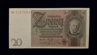 Banconota da 20 Reichsmark emessa nel 1929 dalla Reichsbank. - Serie: M-2247082 - Data di emissione: 22 gennaio 1929 - Basata sulla legge bancaria del 30 agosto 1924 - Presenta il ritratto di un uomo con barba e cravatta