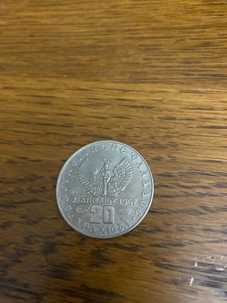 Moneta in argento da 20 Dracme greche, coniata nel 1967. - Dritto: Raffigurazione di un'aquila con ali spiegate. - Rovescio: Valore 20 al centro, con data 21 ΑΠΡΙΛΙΟΥ 1967 e iscrizione ΔΡΑΧΜΑΙ.