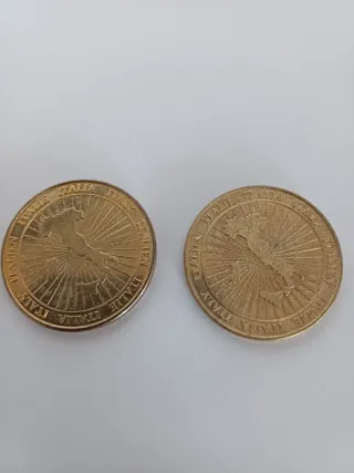 Vendo 5 monete da 1000 lire italiane. - Monete commemorative. - Dettagli raffiguranti figure storiche. - Bordo in metallo dorato e centro in metallo argenteo.