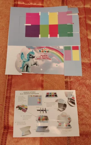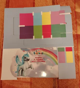 Espositore a tema Kinder Sorpresa dedicato agli unicorni. Perfetto per collezionisti o per allestire un angolo a tema. - Design colorato con arcobaleno e unicorno alato. - Pannello superiore con riquadri colorati. - Pannello frontale con immagine illustrata.