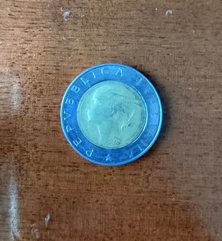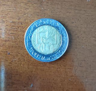 Moneta da 500 lire commemorativa dei 50 anni della Polizia di Stato. La moneta ha un particolare valore in quanto presenta delle piccolissime imperfezioni e sarebbe dovuta essere ritirata. Tuttavia la moneta è stata, probabilmente inconsapevolmente, utilizzata nel corso degli anni quindi presenta segni di usura.