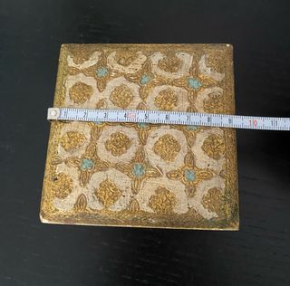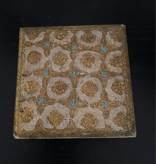 Bellissima scatolina antica, quadrata, con decorazioni in oro e turchese. - Dimensioni: circa 10x10 cm. - Materiale: legno. - Stile: antico, decorativo.