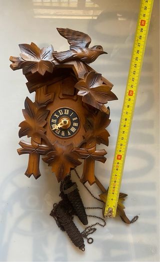 Bellissimo orologio a cucù in legno, lavorato finemente. Un oggetto unico per arredare la tua casa con stile. - Realizzato in legno scuro - Dettagli intagliati a mano - Staccato il fregio e rotta una lancetta