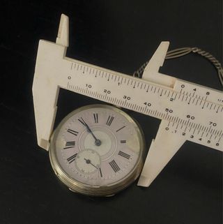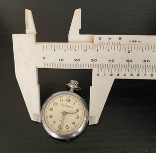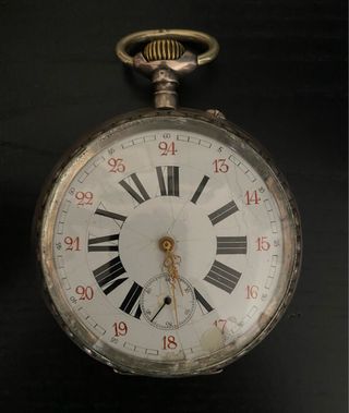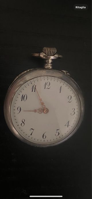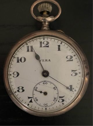 Orologio da tasca con quadrante bianco e numeri arabi. - Marca: VERA - Quadrante secondario per i secondi. - Cassa in metallo. - Corona e anello per catena. NON FUNZIONANTE