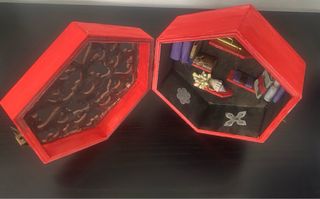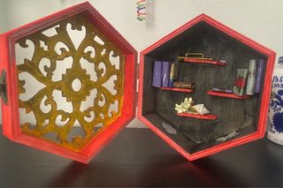 Deliziosa libreria in miniatura a forma esagonale, con dettagli curati. - Struttura esterna rossa. - Porta con decorazione traforata dorata. - Interno con piccole mensole. - Oggetti decorativi inclusi: libri, conchiglia, corallo e trombetta.