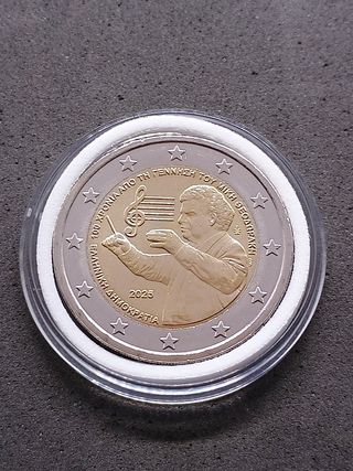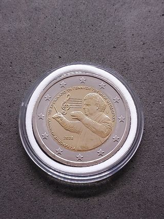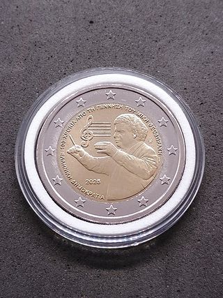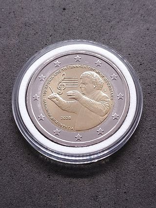 Moneta commemorativa da 2€ della Grecia del 2025. - Celebra il centenario della nascita di Mikis Theodorakis. - Design con il ritratto del compositore e simboli musicali. 70