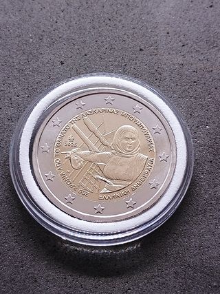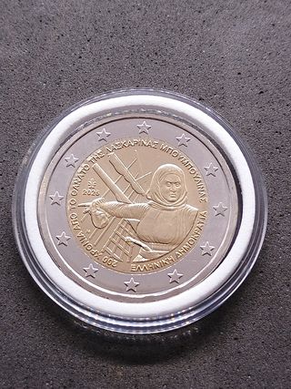 Moneta commemorativa da 2€ della Grecia del 2025, dedicata a Laskarina Bouboulina. - Celebra il 200° anniversario della sua morte. - Raffigura la figura eroica di Bouboulina. - Design con stelle e iscrizioni in greco. 69