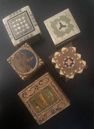 Bellissimo set di quattro scatoline antiche, perfette per conservare piccoli oggetti o come elementi decorativi. - Scatola con intarsi in madreperla e motivi geometrici. - Scatola con decorazione floreale e intagli. - Scatola con scena equestre dipinta. - Scatola con tre figure dipinte e cornice dorata.