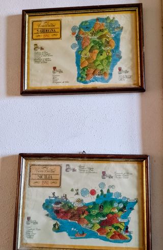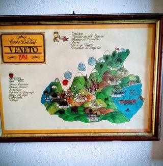 5 stampe incorniciate raffiguranti mappe di alcune regioni Italiane,del 1981. - con indicazioni di vini e località - Cornici in legno scuro.
