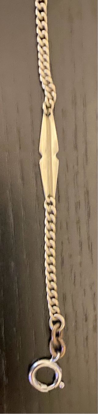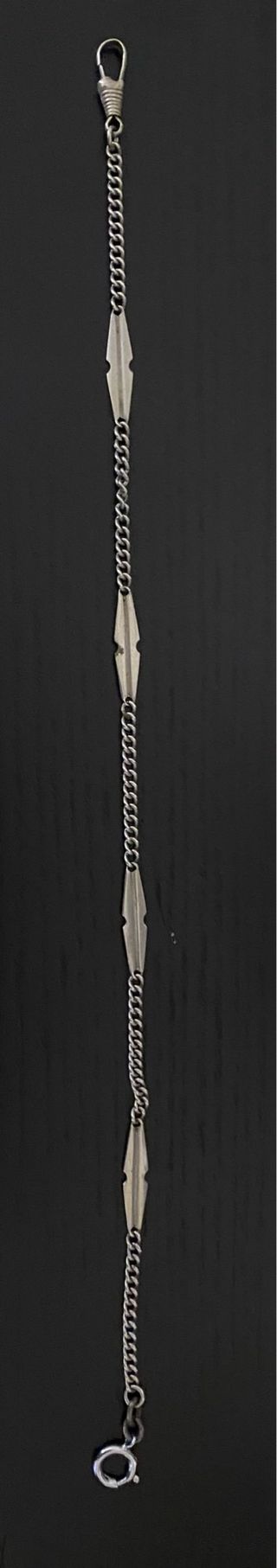 Catena in metallo per orologio da tasca, con moschettone e anello. - Design a maglie alternate. - Elementi decorativi a forma di punta di lancia. - Anello terminale.