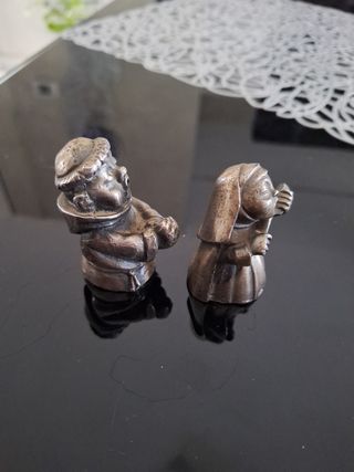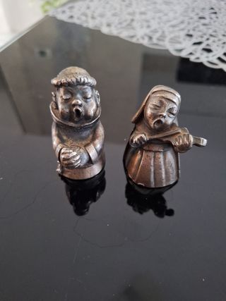 Due statuine vintage raffiguranti un monaco e una suora. - Materiale metallico. - Dettagli curati.