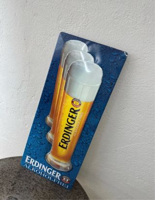 Insegna pubblicitaria Erdinger Alcoolfrei con tre bicchieri di birra. - Design a sfondo blu con gocce d'acqua. - Logo Erdinger Alcoolfrei ben visibile.