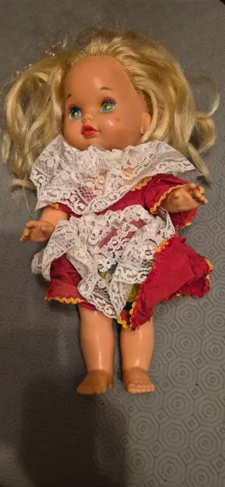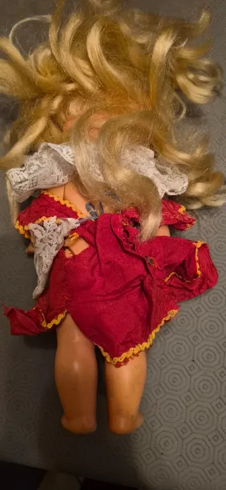 Bambola vintage con capelli biondi e occhi azzurri, indossa un grazioso vestito. - Vestito con dettagli in pizzo bianco. - Maniche rosse con bordi dorati. - Dettagli colorati sul vestito.