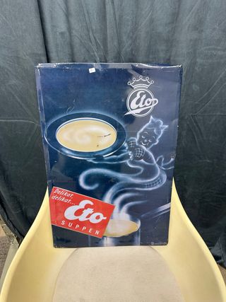 Insegna pubblicitaria vintage del marchio Eto. - Design retrò con logo Eto e corona. - Raffigurazione di una figura che serve una zuppa fumante. - Scritta Delikat, delikat... Eto SUPPEN su sfondo rosso.