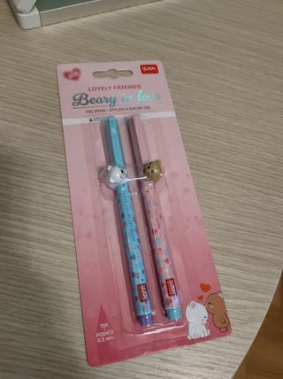 Set di due confezioni di penne cancellabili Legami. - Una confezione Beary in love con due penne gel. - Una confezione Hoppy Easter con due penne cancellabili. - Le penne hanno decorazioni a tema orsetti e coniglietti.