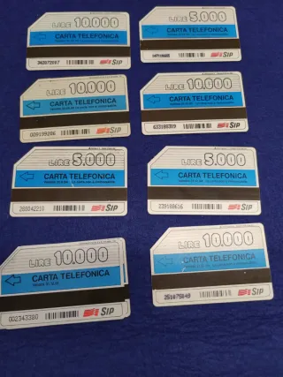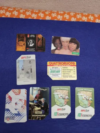 Collezione di schede telefoniche SIP, a tiratura limitata. - Scheda Cremona 1945-1985 10.000 - Scheda Quattroruote con numeri utili 10.000 - Scheda Aeroporti di Roma 10.000 - Scheda con musicisti che suonano 5.000 - Due schede Italfor Pellicano Esercito SIP 5.000-10.000 - Scheda Ostuni l'Osteria 10.000 - Scheda United colors of Benetton 5.000