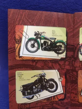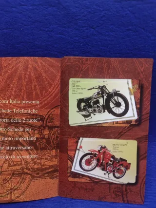 Collezione di schede telefoniche Storia delle 2 ruote. Schede telefoniche usate a tiratura limitata 70.000 mila pezzi. - Otto schede dedicate a moto importanti. - Gilera 350 gran sport Italia 1930 - Moto Guzzi Airone 250 cc Italia 1950 - BSA M20 500 cc Inghilterra 1934 - BMW R69 590 cc Germania 1960 - Miller 175 Balsamo 175 cc Italia 1934 - Thiumph Bonneville T120TT 650 cc Inghilterra 1967 - Harley Davidson Wla 750 cc Usa 1942 - Norton commando PR 750 cc Inghilterra 1970 Disponibili 2 folder completi