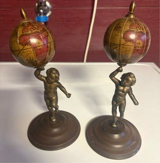 Coppia putti con mappamondo vintage alti 21 cm e basamento con diametro di 9 cm.