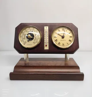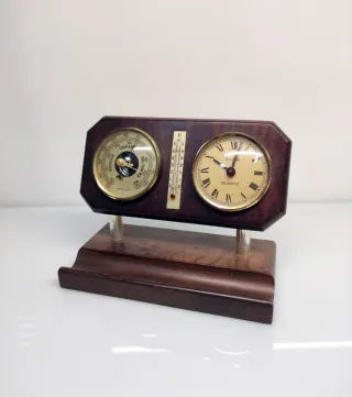 Stazione Meteo da Tavolo Vintage Anni '70 Barometro Termometro Orologio Quarzo Legno Radica Larghezza circa 19 cm Ottime condizioni funzionante.
