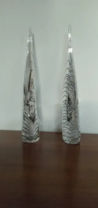 Coppia di grandi pesci in vetro di Murano, realizzati dalla vetreria Formia. Realizzati in vetro neutro con decorazione color ametista scura. Di dimensioni importanti. Misurano cm 38h x 15 x 6 - Materiale: Vetro di Murano - Produttore: Vetreria Formia ora Mian - Design: Pesci stilizzati trasparenti con sottili linee ametista Etichetta presente su un elemento a confermare autenticità, l' altra si è persa nel tempo. Parte della mia collezione personale Altri vetri di Murano autentici nel mio armadio