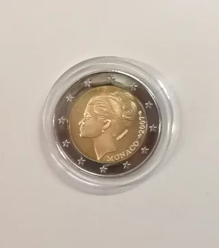 Riproduzione del rarissimo 2 Euro del 2007 del Principato di Monaco dedicato a Grace Kelly. Conservato in oblò protettivo trasparente. Condizioni FDC. Molto bello e lucente! - Dritto: Ritratto di Grace Kelly. - Rovescio: Valore nominale e mappa dell'Europa. - Anno di conio: 2007. - Paese: Monaco.