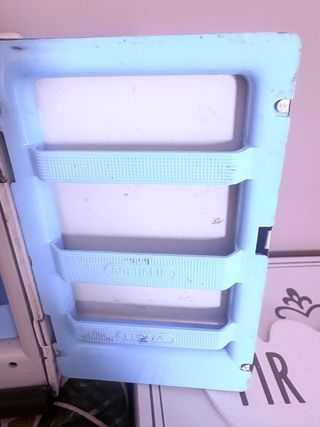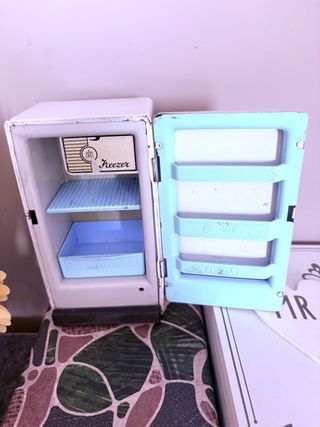 Frigorifero giocattolo vintage in latta prodotto dalla ditta AMB (A.M.B. Marchesini) di Bologna, Italia risalente agli anni 60. Dimensioni 16x8.5x7 cm.