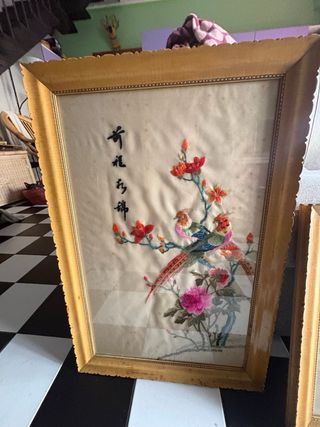 Set di tre quadri decorativi in seta cinese, realizzati a mano con ricami. - Tecnica: Ricamo su seta. - Soggetti: Scene con uccelli e fiori. - Cornici dorate incluse. Lotto 3 quadri seta cinese ricamati vintage 45x67 cm.