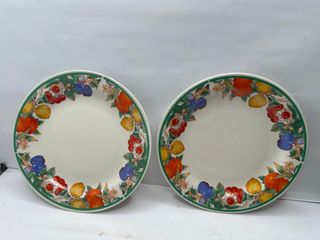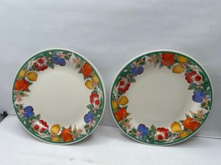 Set di due piatti da collezione con un vivace bordo decorato con frutta e foglie verdi. - Design floreale e fruttato. - Bordo verde decorativo.